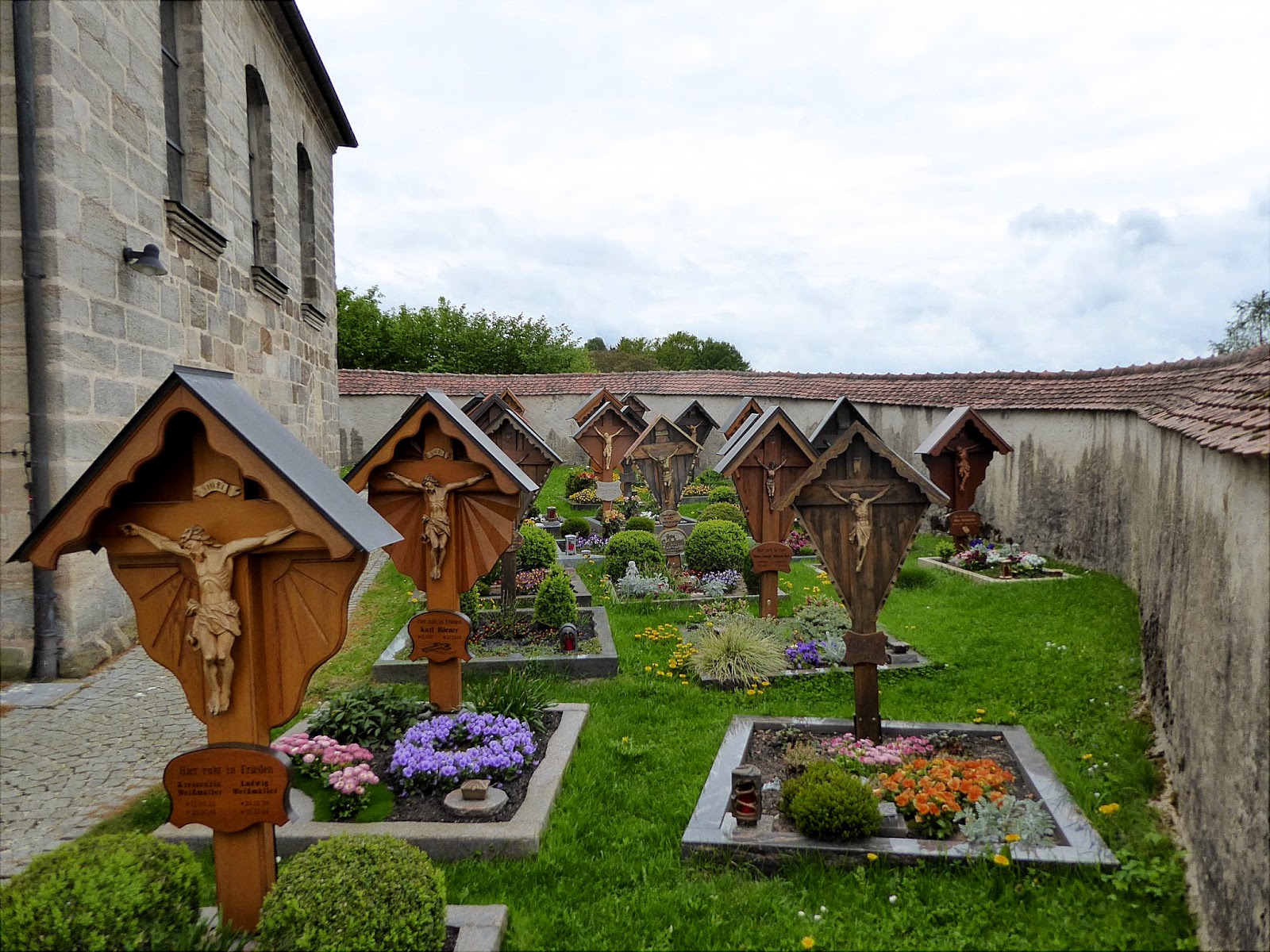 So kam ich nach weiteren stillen Kilometern durch Feld und Wald in den kleinen Ort Dorsbrunn, in dem ich mir unbedingt den Friedhof mit seinen Holzkreuzen ansehen wollte.